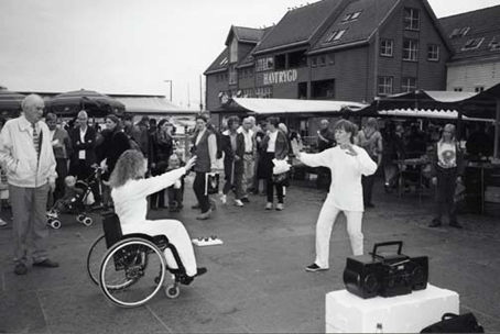 Students Silje (left) and Sunniva (right) practicing at a fish market in Norway. >>